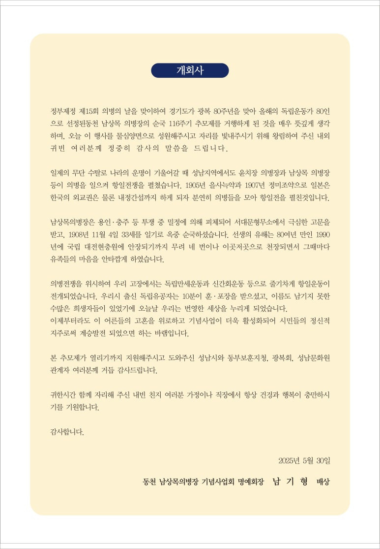 이어, 최명숙 성남문화원 (부설) #성남학연구소장의 ‘약사 보고’에 이어, 신상진 성남시장, 김대진 문화원장, 손애진 #경기동부보훈지청 장의 ‘추모사’가, ‘헌정 공연’으로 #성남시립예술단(해금 김경흔, 신디 오세진, 첼로 김정현)의 ‘하늘빛 그리움’과 춤자이예술단 정미래 무용가의 혼풀이 춤, ‘헌화 및 분향’, 임경수 광복회 성남지회장의 만세 삼창 순으로 진행하여 의병 정신 계승과 남 의병장의 숭고한 희생정신을 기렸다.