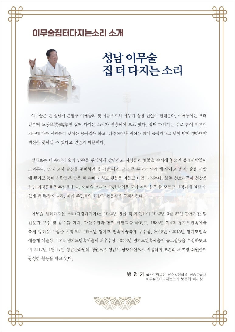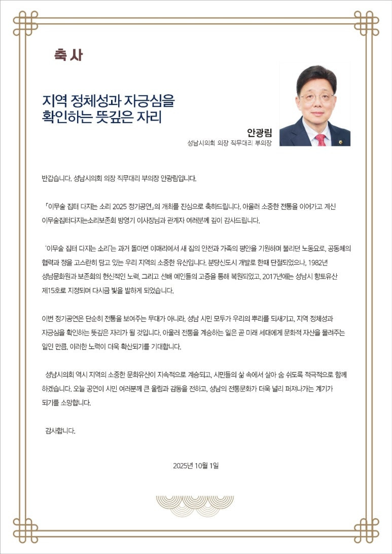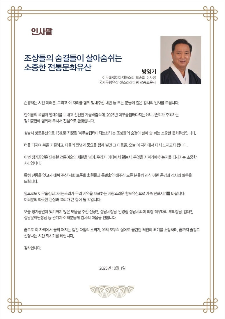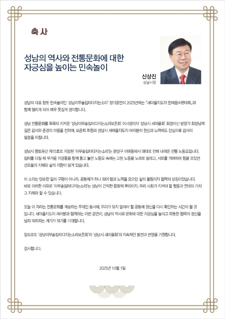 성남지역의 대표 향토 민속놀이인 성남시 향토유산 제15호 ‘이무술집터다지는소리 2025 정기공연’이, 10. 1(수), 새마을운동중앙회 운동장에서, 김정진 성남문화원 사무국장의 해설과 사회, 보존회 이사장인 방영기 국가 무형유산 선소리산타령 전승교육사의 총연출로 열린다.