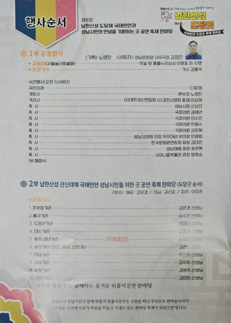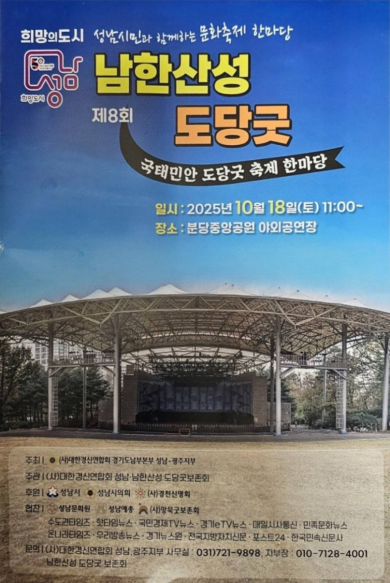 2025년 10월 18일(토) 오전 10시부터 오후 5시까지 분당중앙공원 야외공연장에서 열린 ‘제8회 남한산성 도당굿 국태민안 축제 한마당’이 성남시민들의 뜨거운 관심과 성원 속에 성황리에 마무리됐다.