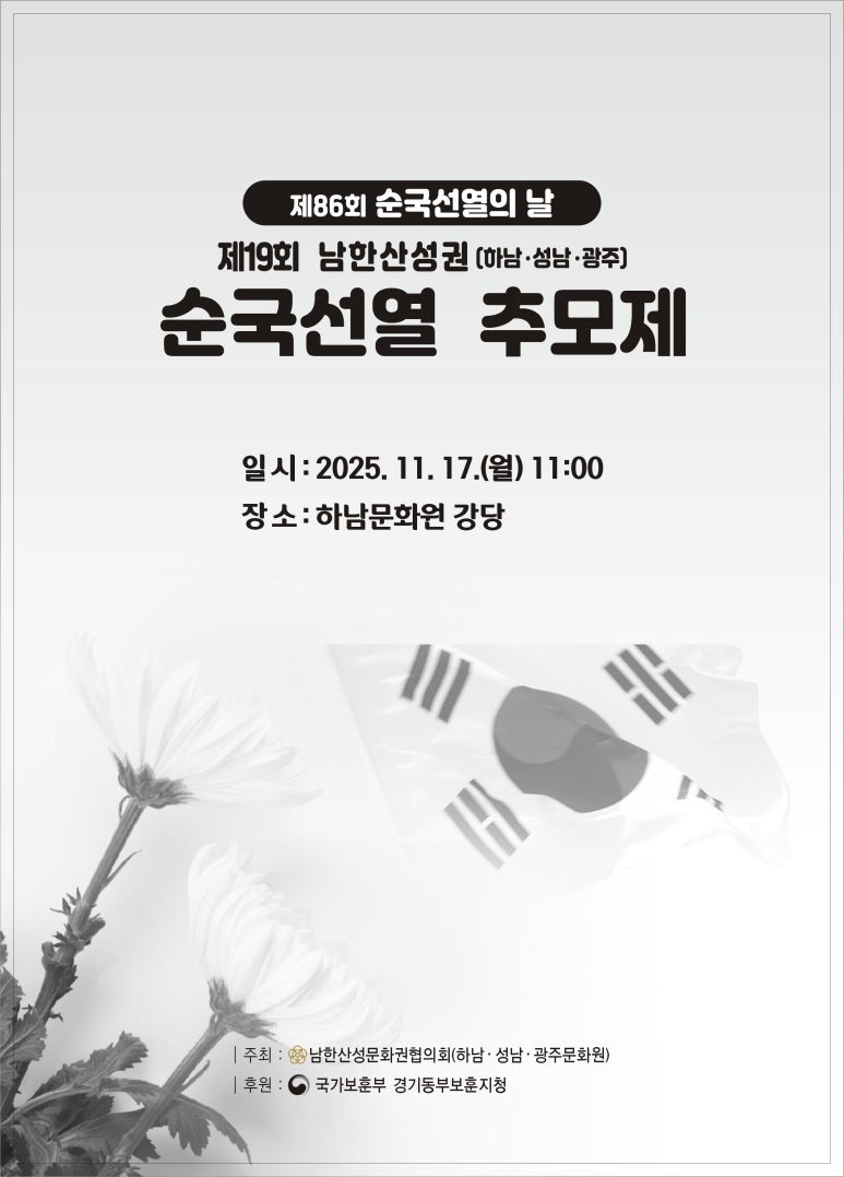 남한산성문화권협의회(광주·성남·하남문화원)가, 오는 11월 17일 ‘제19회 남한산성권 순국선열 추모제’를 하남문화원 강당에서 개최한다.