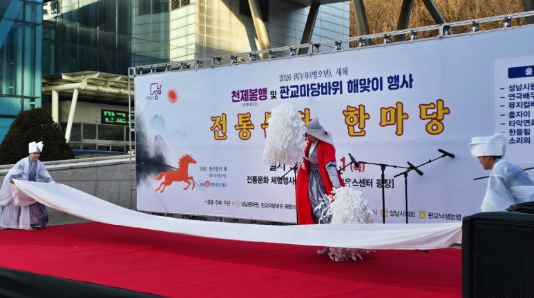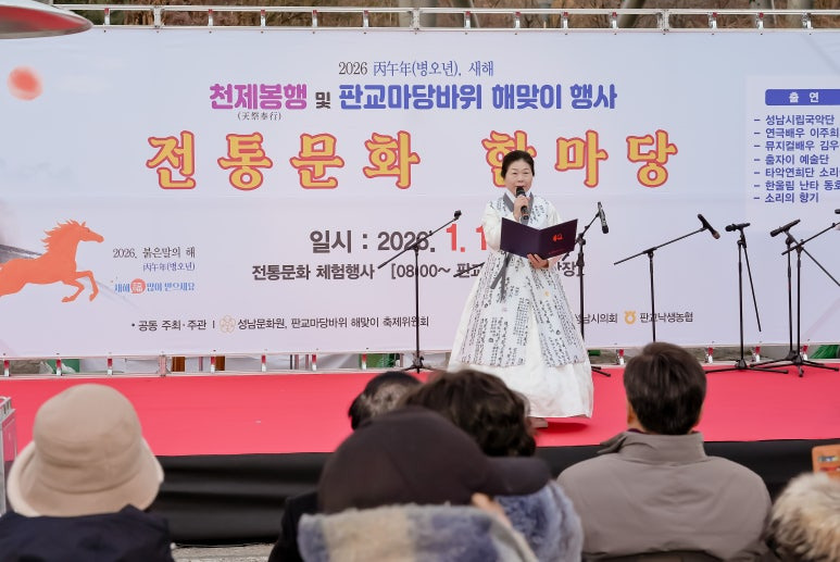 이날 행사는 김정진 성남문화원 사무국장의 사회, 홍진영 성남문화원 (위탁)서현문화의집 관장의 집례로, ‘2026 붉은 말의 해’를 맞아 성남문화원이 주관하는 전통 제례의식인 「천제봉행」을 통해, 성남시의 번영과 풍요, 시민 가정의 건강과 행복을 기원한 뒤, 판교마당바위 해맞이축제위원회가 주관하는 「해맞이 행사」가 이어졌고,