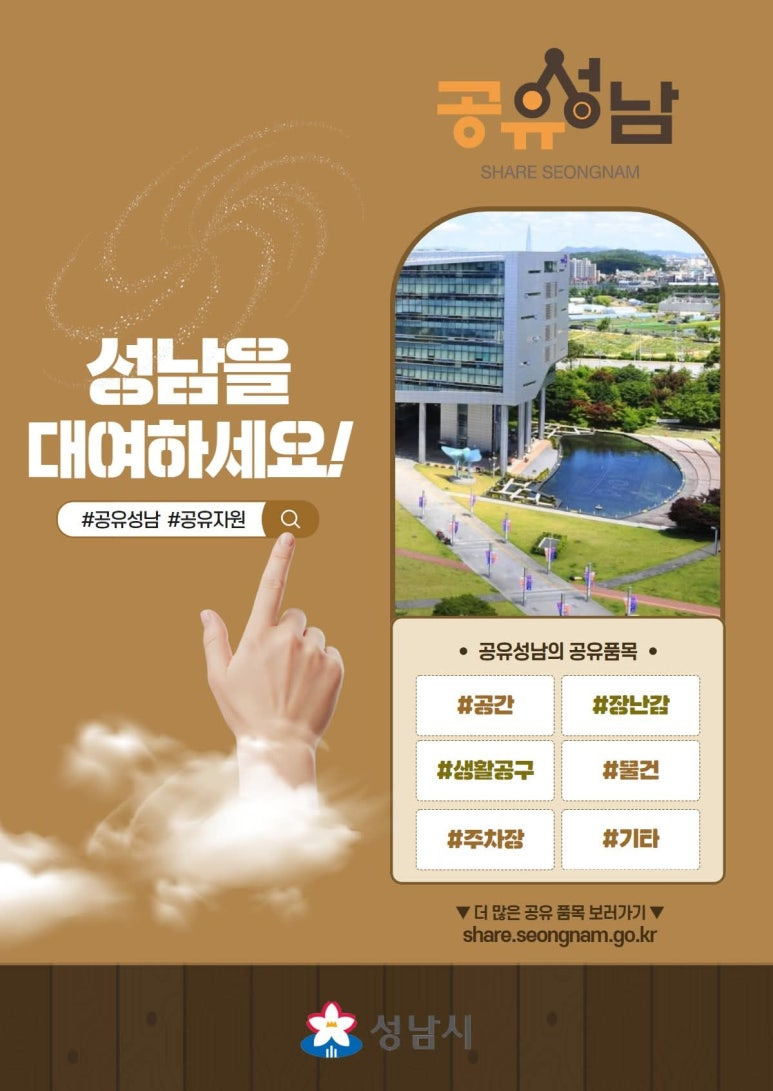 공간부터 물건까지, 필요한 자원을 한 번에! 성남시는 시민이 함께 이용할 수 있는공공자원을 모은 공유경제 플랫폼 **‘공유성남’**을 운영하고 있어요