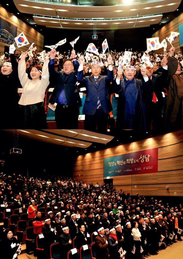 이어서 국민의례, 임경수 광복회 성남지회장의 ‘기미 독립선언서’ 낭독, 김대진 문화원장의 ‘개회사’, 신상진 성남시장의 ‘기념사’, 성남시립합창단이 1919년 차가운 서대문형무소 여옥사 8호실에서 울려 퍼지던 노래 ‘대한이 살았다’ 헌정공연, ‘삼일절 노래’ 제창 후 참석자 모두 ‘만세삼창’으로 이어진다.