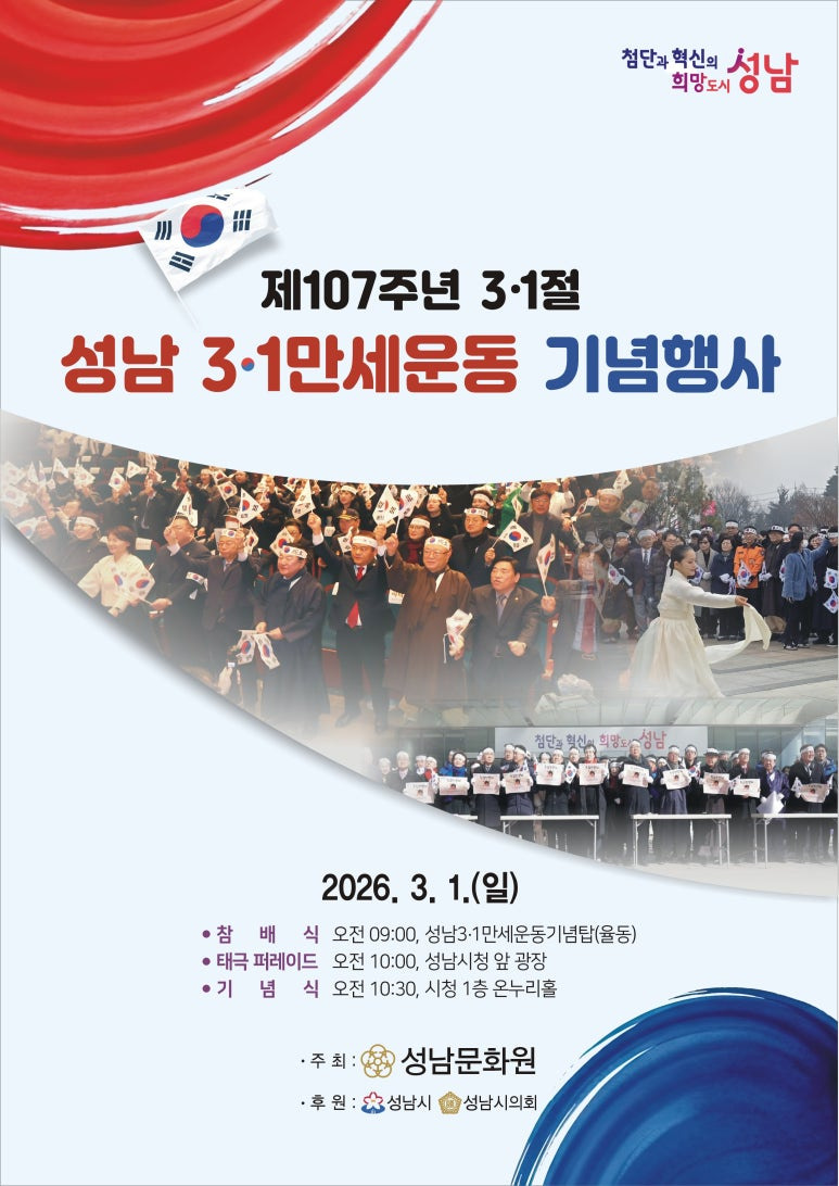 성남문화원(원장 김대진)은, 제107주년 3·1절을 맞아, 성남 3·1 만세운동기념행사를 3월 1일(일) 시 일원에서 개최한다.
